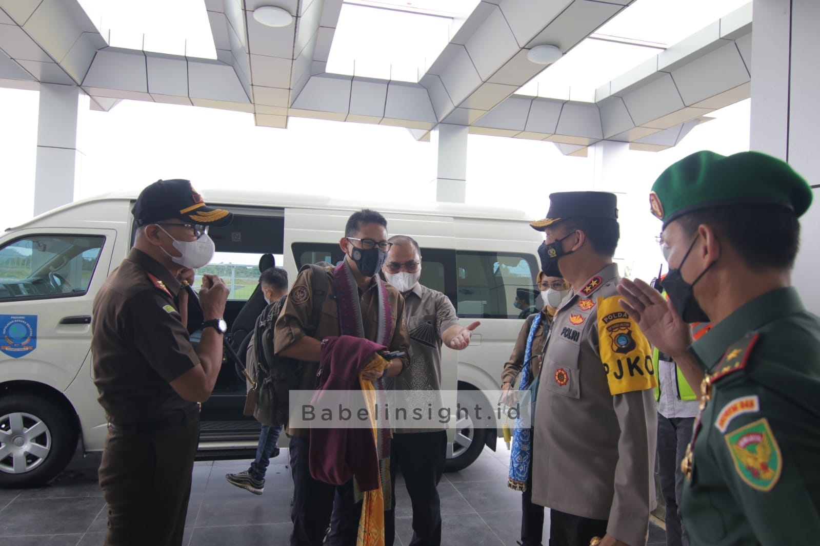 Gubernur Kepulauan Bangka Belitung (Babel), Erzaldi Rosman menyambut kedatangan Menteri Pariwisata dan Ekonomi Kreatif (Menparekraf) RI, Sandiaga Salahuddin Uno, di Ruang VIP Bandara Depati Amir, Rabu (20/4/2022).