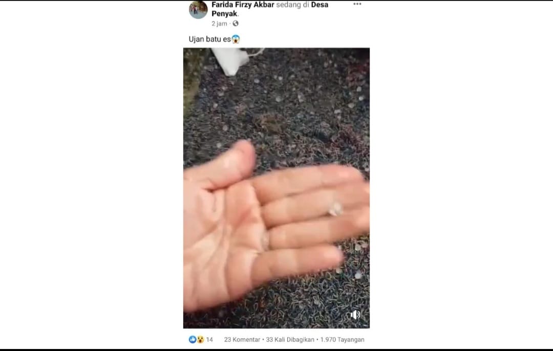 Dari postingannya, dia mengunggah video dugaan adanya fenomena hujan es di Desa Penyak, Kabupaten Bangka Tengah (Bateng). Video yang ia unggah sudah dibagikan sebanyak 36 kali dengan 2.176 tayangan, hingga pukul 16.27 WIB.
