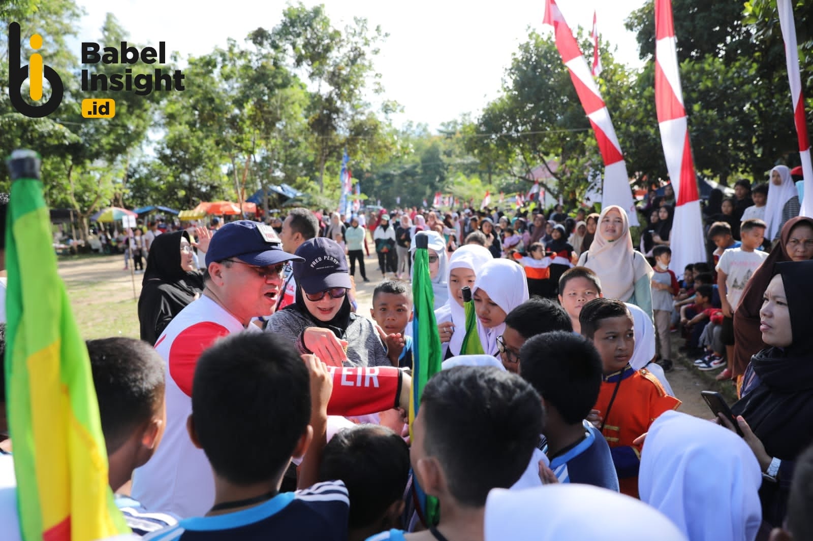 Erzaldi tampak dekat dengan anak-anak saat membaur bersama di "Festival Kampung Dul Betuah". Kegiatan ini mendapat respons meriah yang dihadiri ribuan peserta. Foto: babelinsight.id