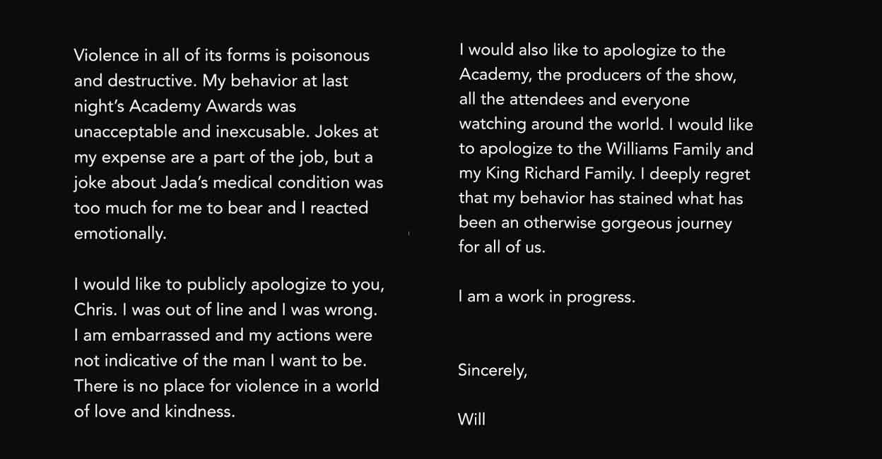 Tak lama setelah itu, will smith pun mengunggah permintaan maaf dalam akun instagramnya yang menuliskan bahwa, tak ada pembenaran apapun tentang kekerasan yang dilakukannya dan dirinya memang sudah melewati batas ketika melakukan pemukulan tersebut.