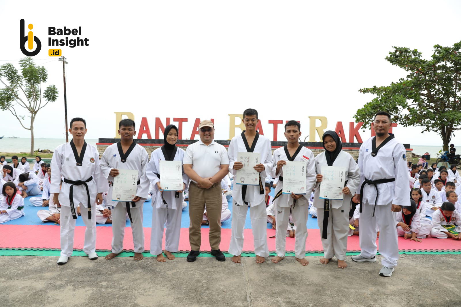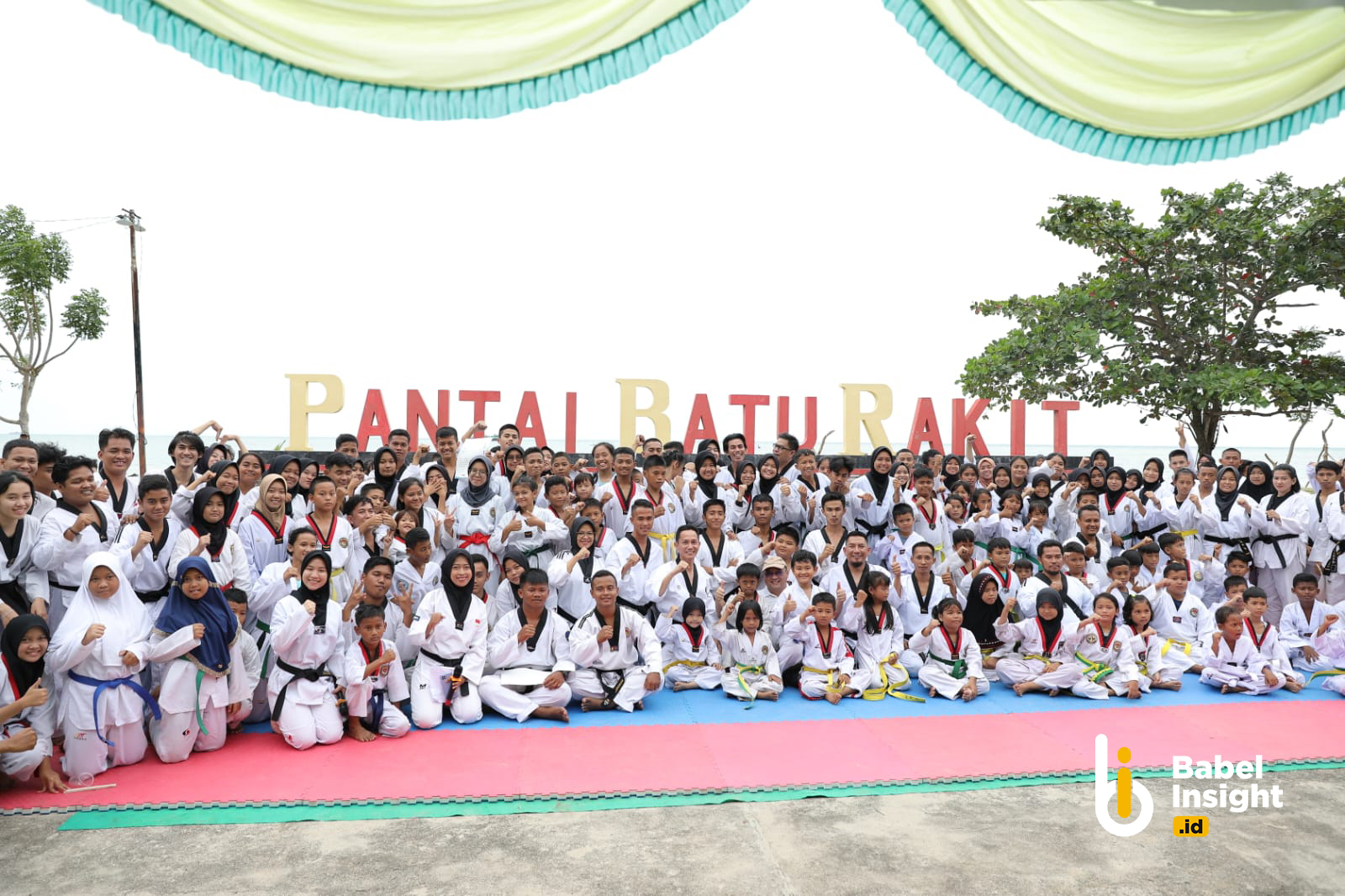 Erzaldi bersama para atlet taekwondo dalam kegiatan Penyematan Sabuk Hitam DAN Kukkiwon dan latihan bersama Taekwondo Pengprov. Kepulauan Bangka Belitung, di Pantai Batu Rakit, Muntok, Kabupaten Bangka Barat, Sabtu (30/7/22)/foto: babelinsight.id