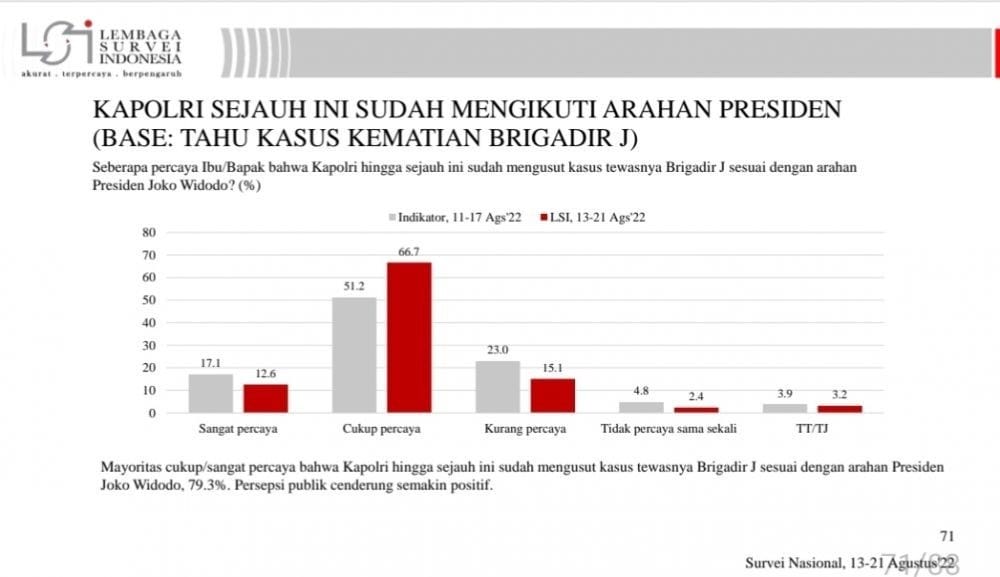Sementara, dalam hasil survei yang dilakukan pada periode 13 Agustus 2022 hingga 21 Agustus 2022, terungkap bahwa 79,3 persen responden percaya bahwa upaya yang dilakukan oleh Kapolri Jenderal (Pol) Listyo Sigit Prabowo saat ini telah sesuai instruksi Presiden Joko "Jokowi" Widodo.