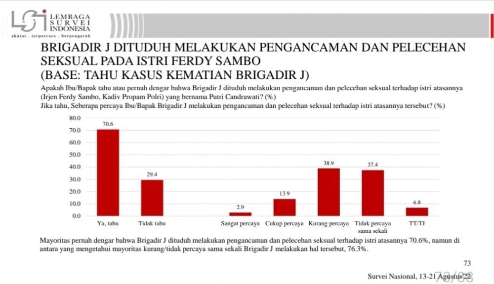 Sementara, 37,4 persen responden tidak percaya sama sekali Brigadir J telah melecehkan istri bosnya tersebut. Bila digabung, total ada 76,3 persen responden yang tak percaya terhadap alasan yang memicu Sambo secara keji membunuh Brigadir J.