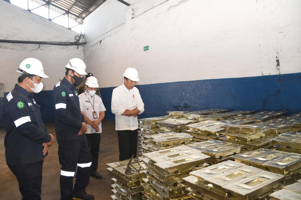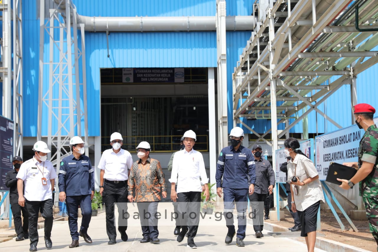 Presiden Joko Widodo bersama Penjabat (Pj) Gubernur Kepulauan Bangka Belitung (Kep. Babel) Ridwan Djamaluddin dan rombongan meninjau pembangunan Top Submerged Lance (TSL) Ausmelt yang dikerjakan oleh PT Timah Tbk Muntok/ foto:ikp diskominfo Babel