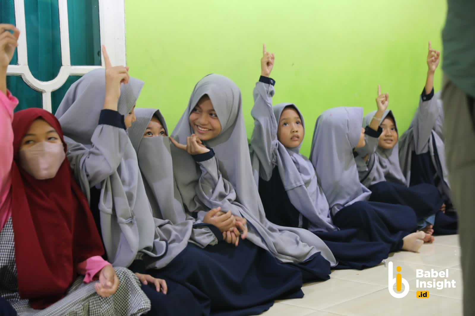 Siswa kelas Al-Qur'an rumah tahfidz Al-Ihsan antusias dengan challenge yang diberikan Erzaldi untuk menyebutkan ayat yang dibacakan. Foto: babelinsight.id