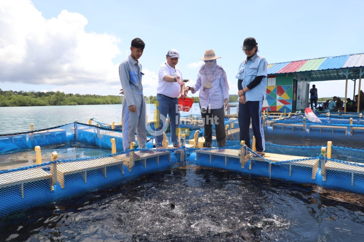Erzaldi Rosman bersama istri, Melati Erzaldi didampingi siswa, menabur pakan ikan yang dibudidayakan oleh para siswa SMK Negeri 1 Selat Nasik, Kabupaten Belitung. Foto: babelinsight.id